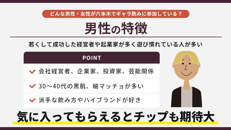 六本木でギャラ飲みをする男性についてまとめると、次の通りです。