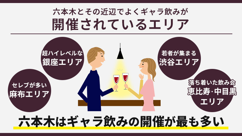 六本木はギャラ飲みの開催がもっとも多いエリアですが、近隣のエリアでも日常的にギャラ飲みが開催されています。